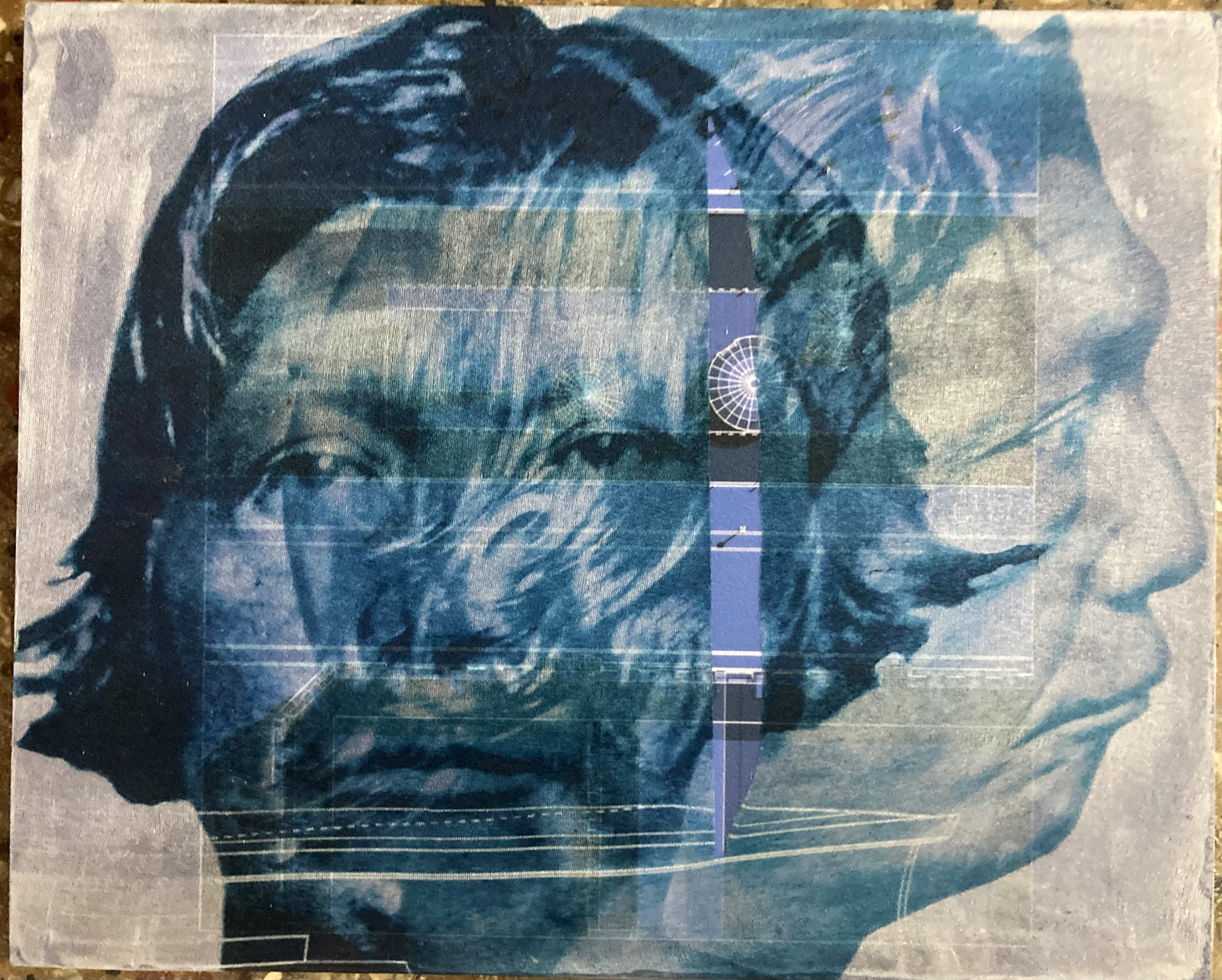 2025 — Impresión digital, intervención y pintura sobre textil. 2 telas 230 × 150 cm cada una con hilos de colores y etiquetas