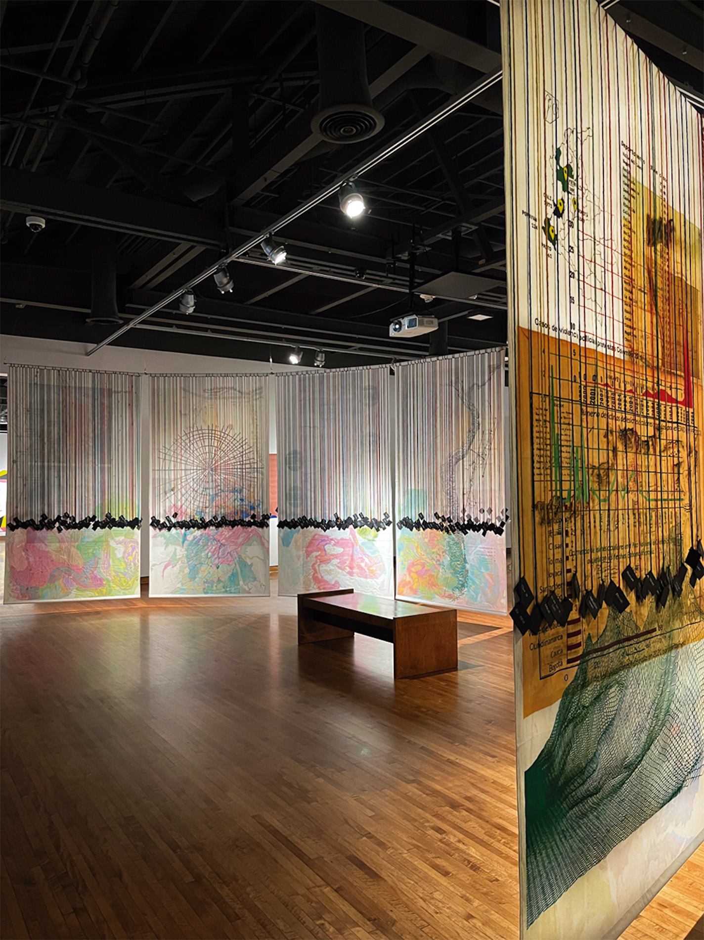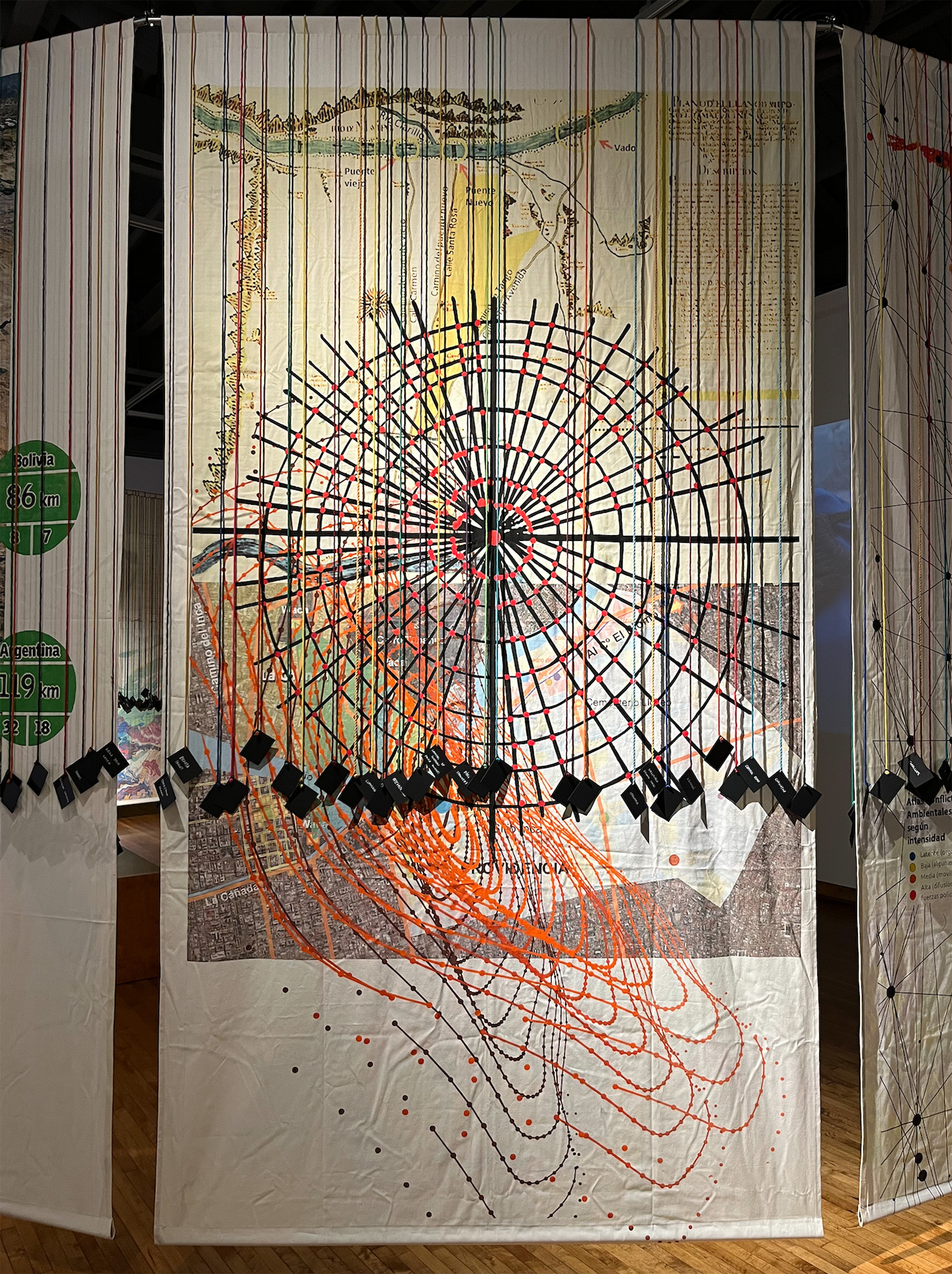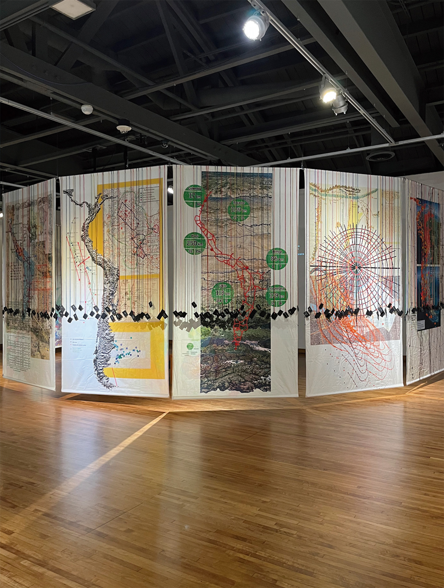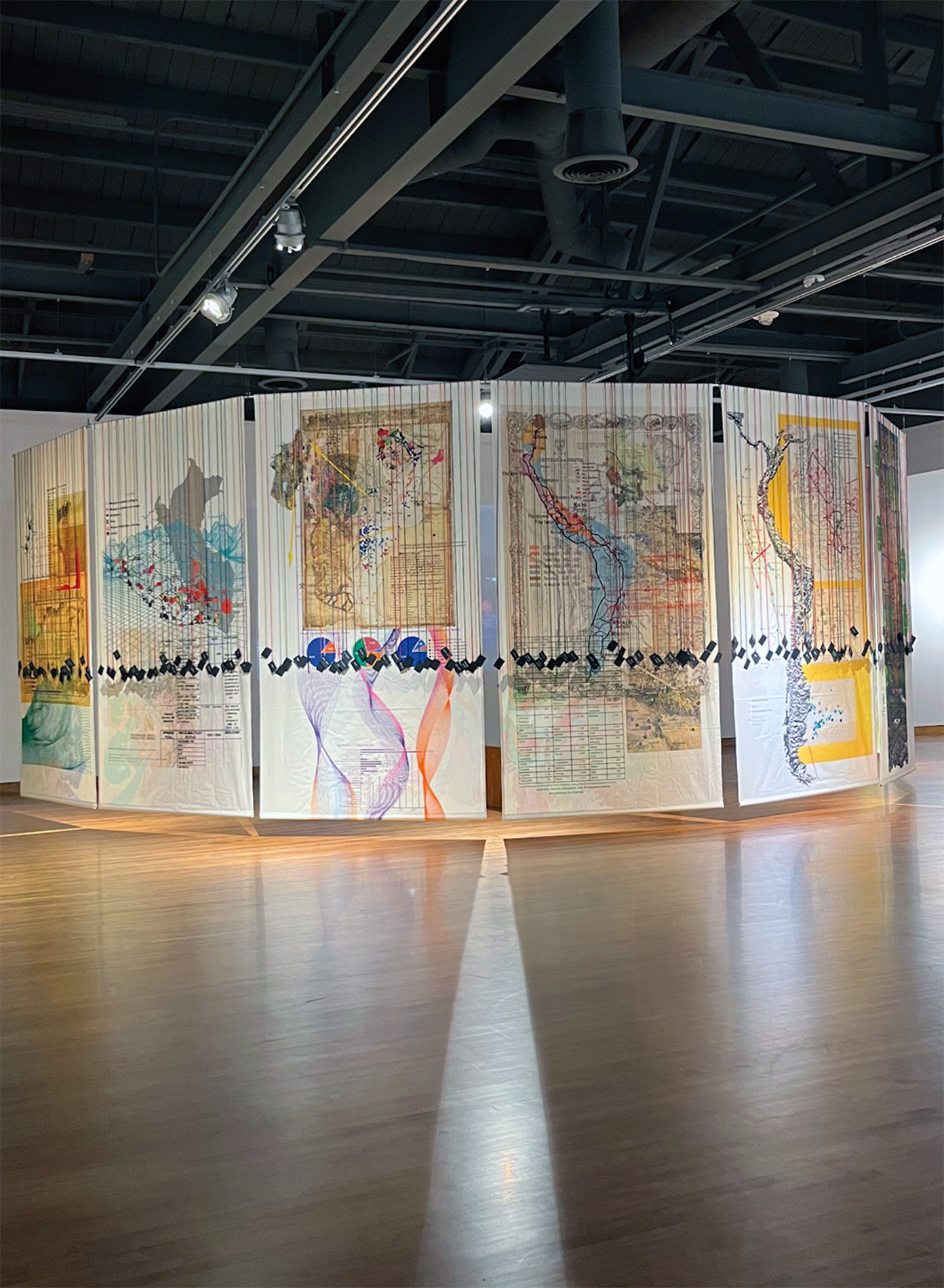 Ciclorama — Instalación circular (11 m de diámetro) con 12 cartografías colgantes en tela translúcida intervenida manualmente + proyección de video a muro.