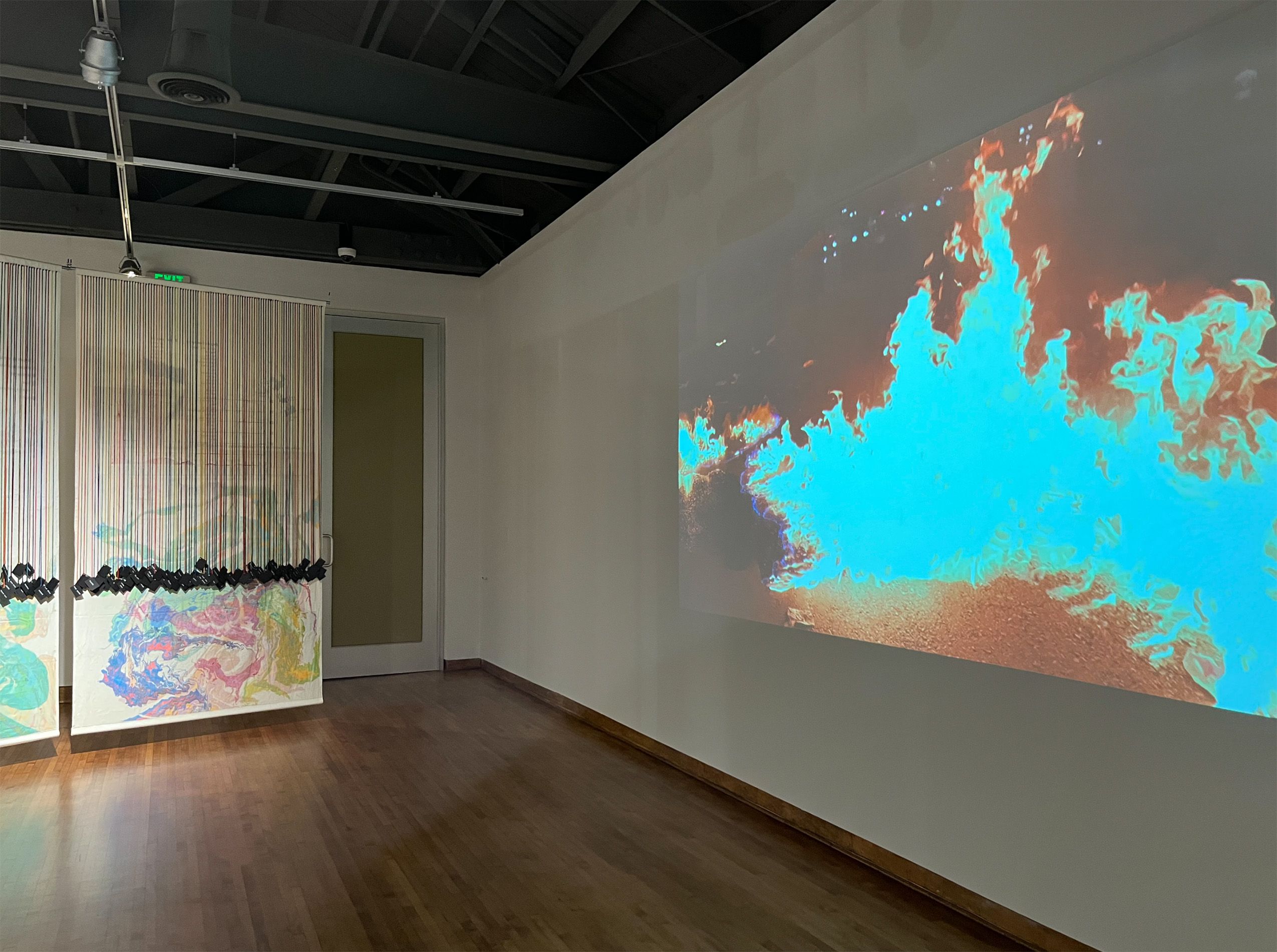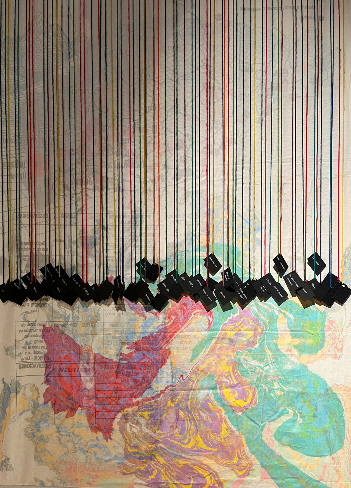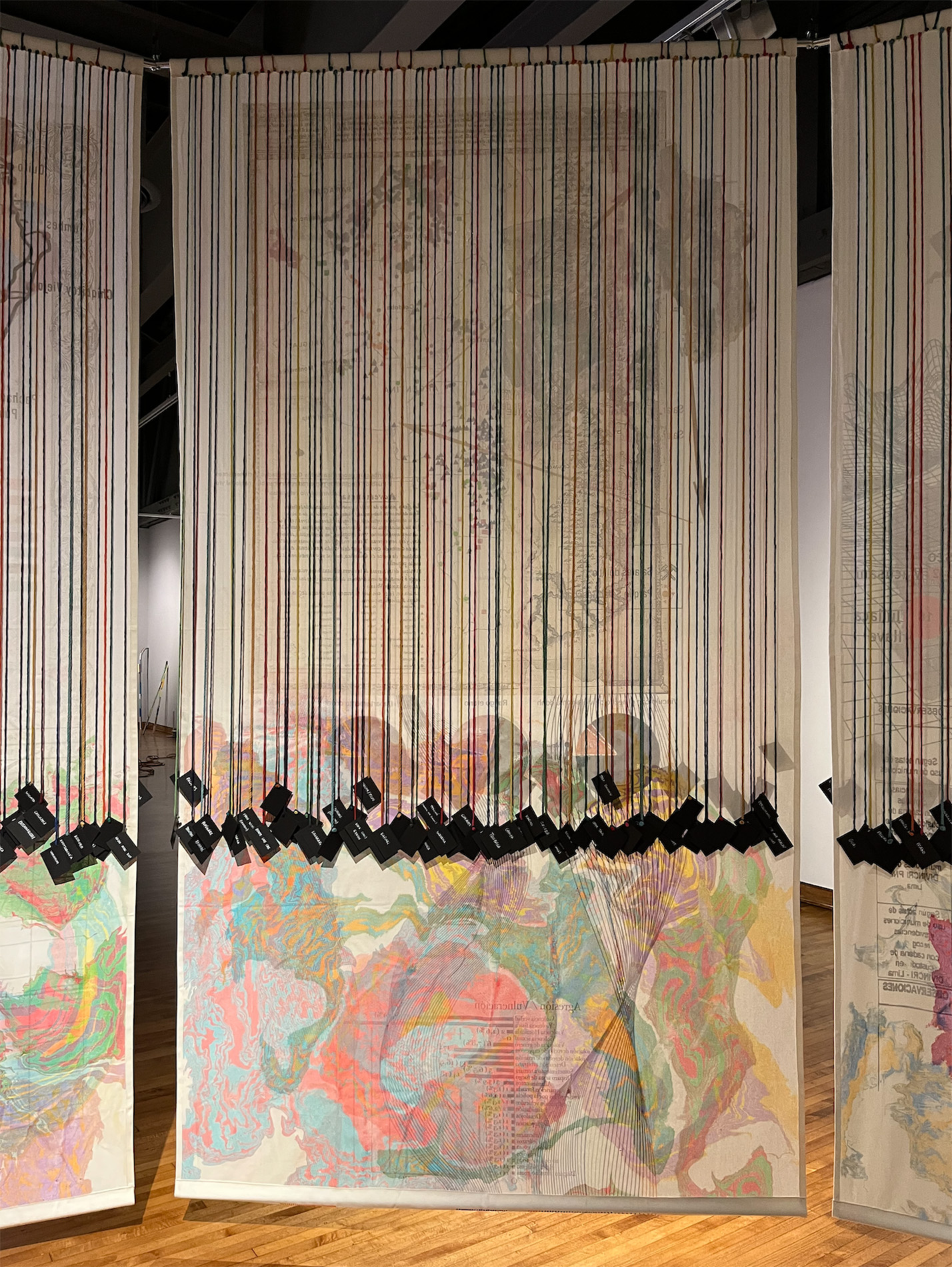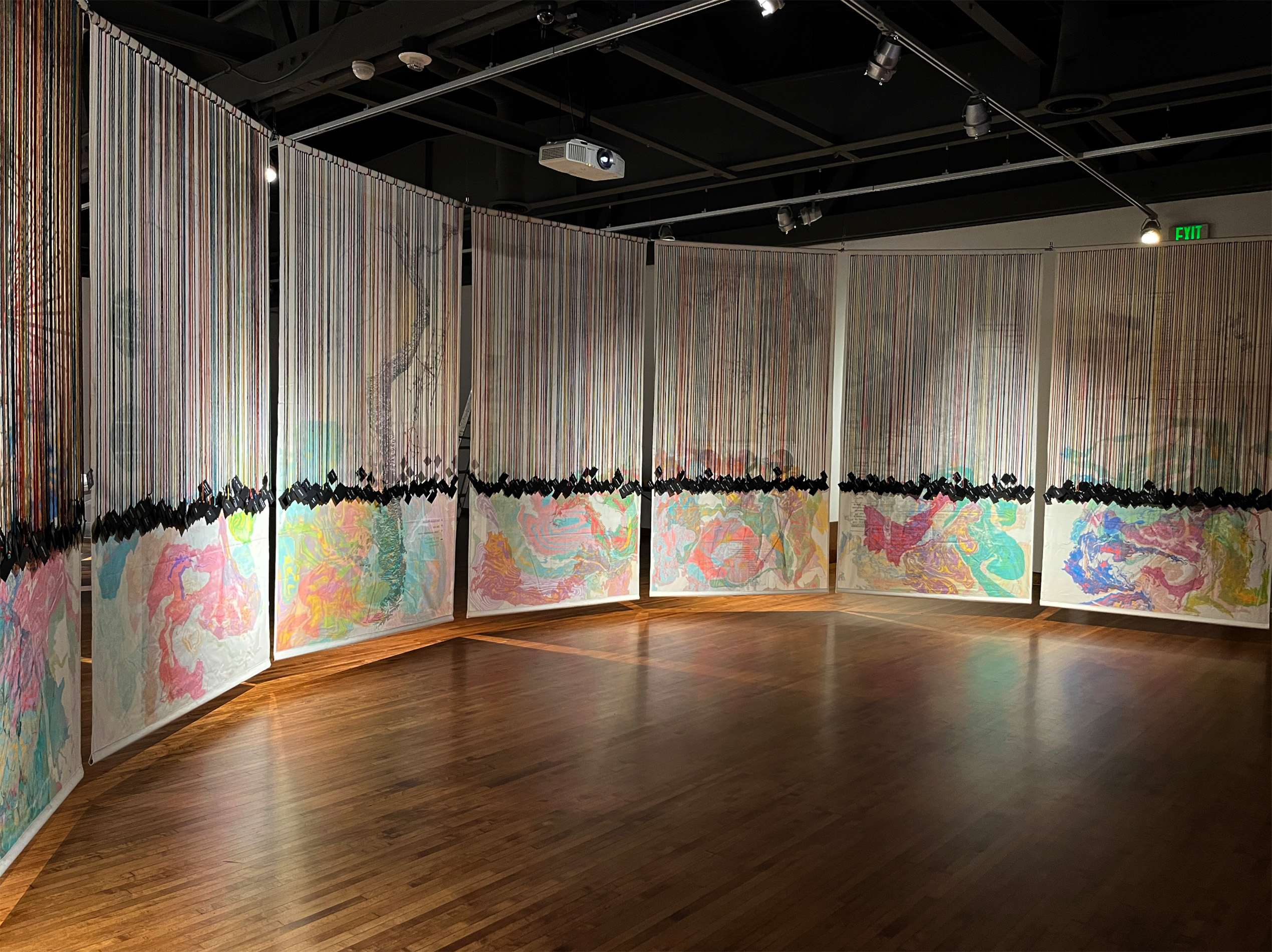 Ciclorama — Instalación circular (11 m de diámetro) con 12 cartografías colgantes en tela translúcida intervenida manualmente + proyección de video a muro.