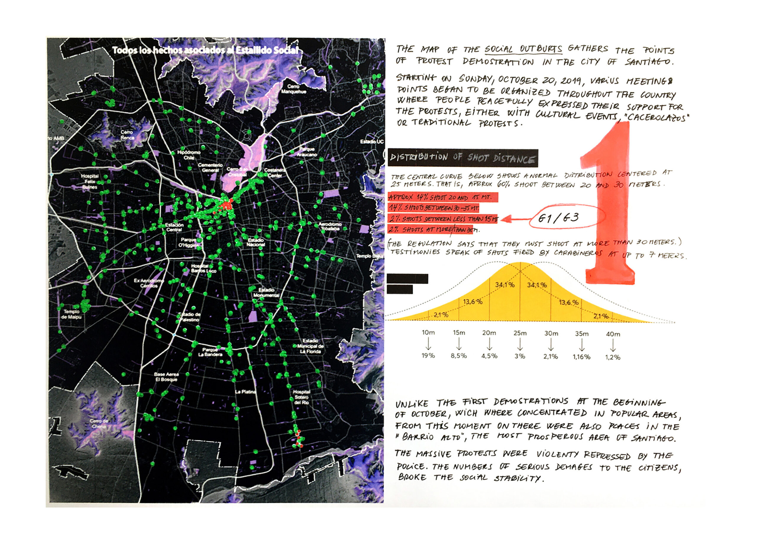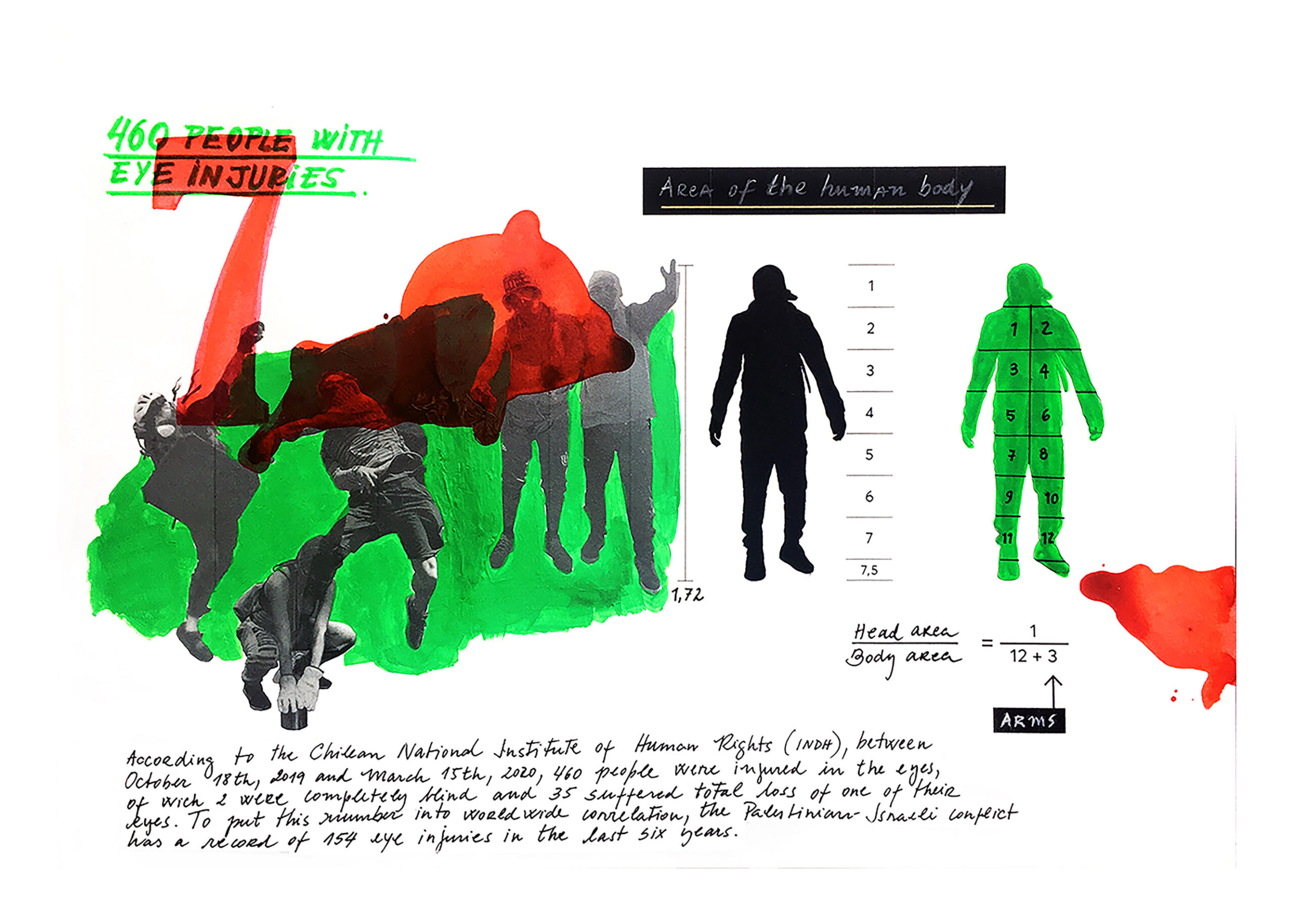 In the group exhibition “are we there yet?”, presented at NOME Gallery (Berlin), Voluspa Jarpa participates with a work that evidences police violence against civilians in the context of the Santiago de Chile protests (2020). The exhibition addresses the spread of contemporary authoritarianism—police brutality, mass incarceration, discrimination, immigration, and state surveillance—and brings together works that interrogate systems of control, power, and resistance. Within this framework, Jarpa’s work operates as both document and image: a way of inscribing on paper what is often administered as “data,” news, or archive, and returning it as a political and visual experience.